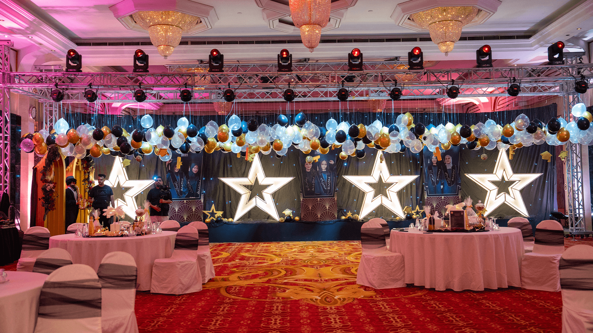 - Moving Head lights: Dynamic moving lighting that adds energy and motion to the event