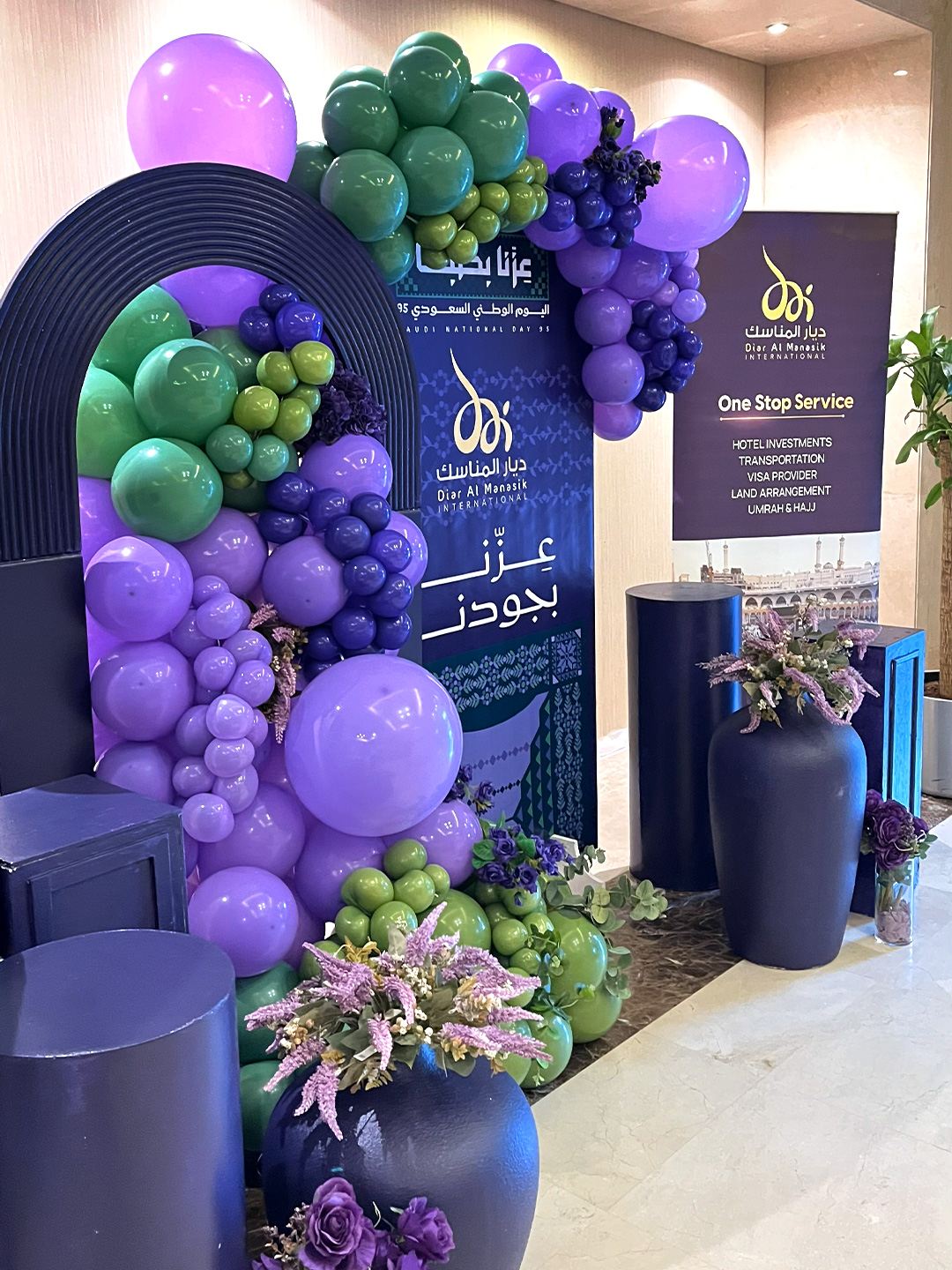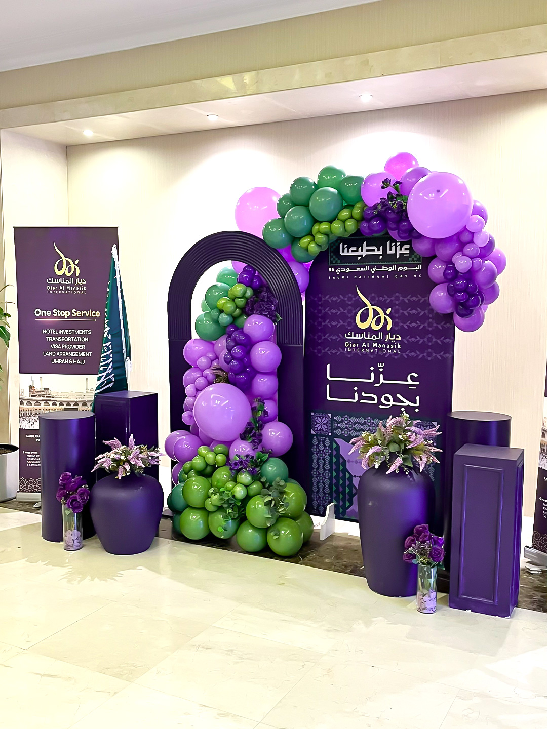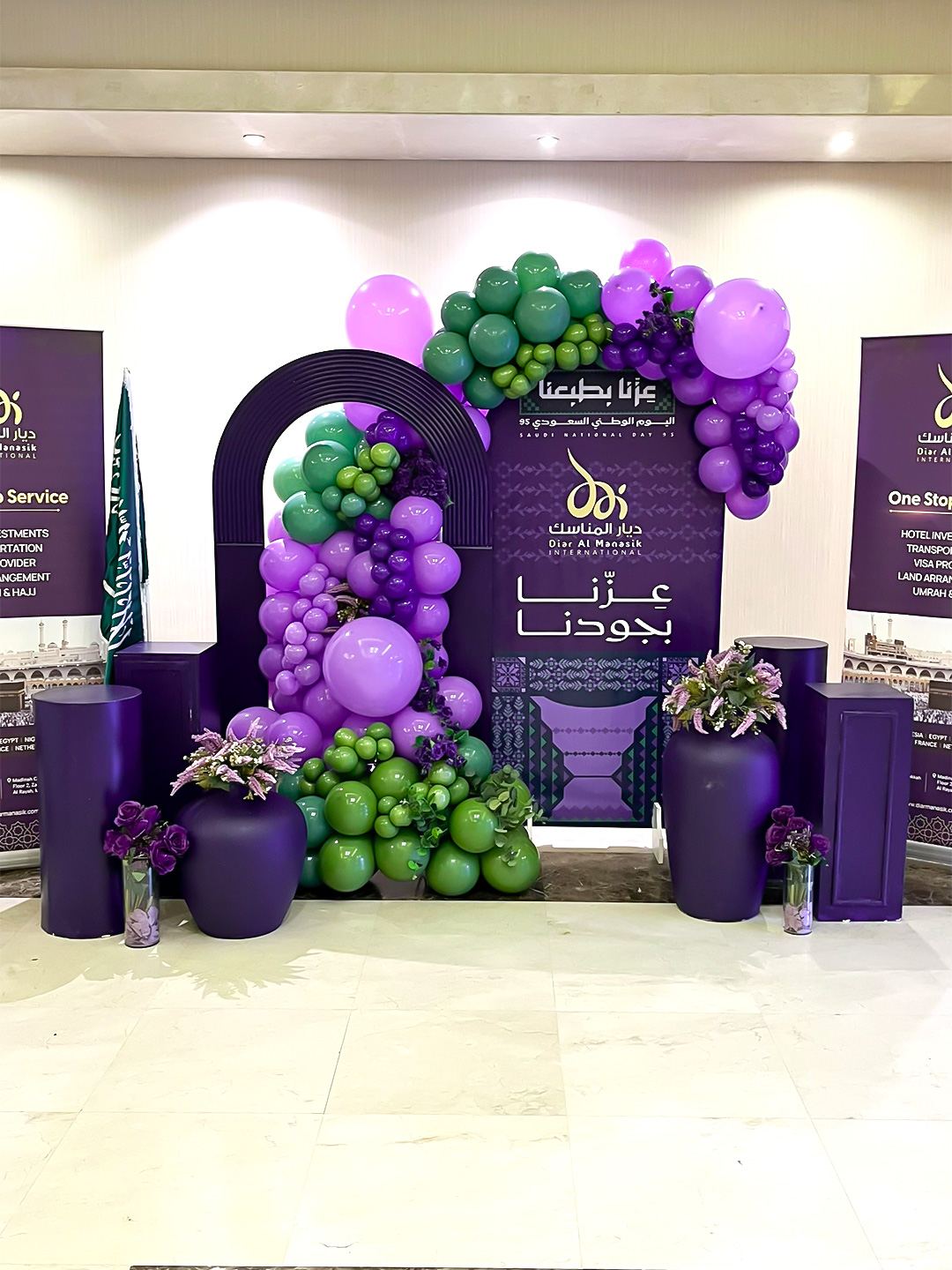 تنسيق احتفالي لليوم الوطني، مع خلفية تحمل شعار الهوية الوطنية وخلفية مفرغة تحتوي تنسيق مميز من البالونات، إضافة إلى مزهريات كبيرة وبنرات للشركة صمم الاحتفال ليضفي جوًا وطنيًا راقيًا ومميزًا ويبرز روح اليوم الوطني بطريقة أنيقة وفاخرة.