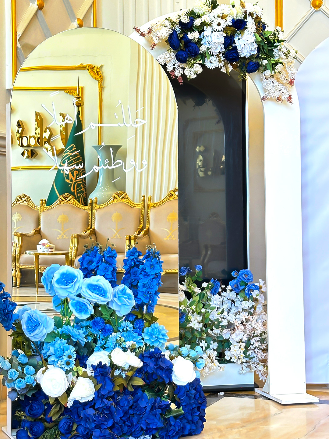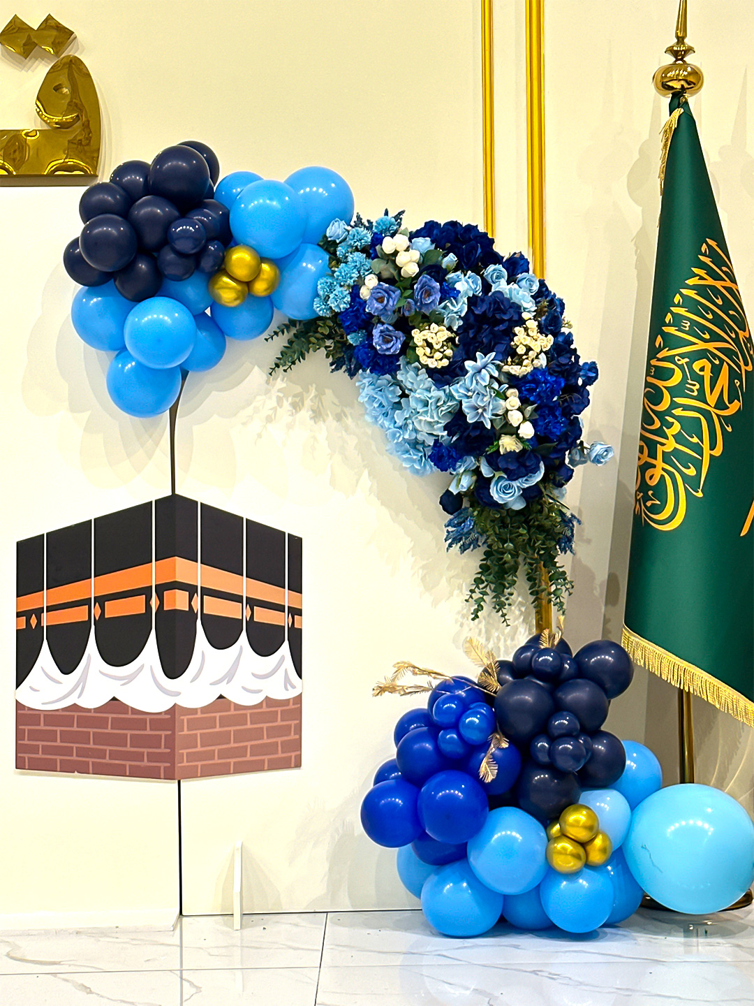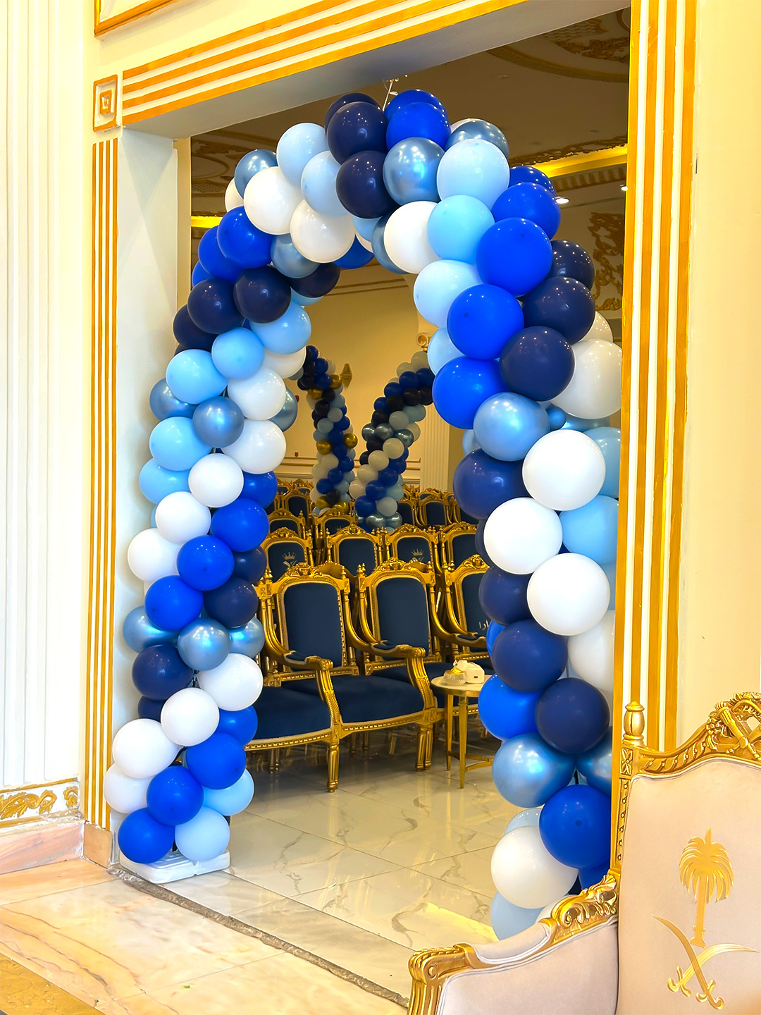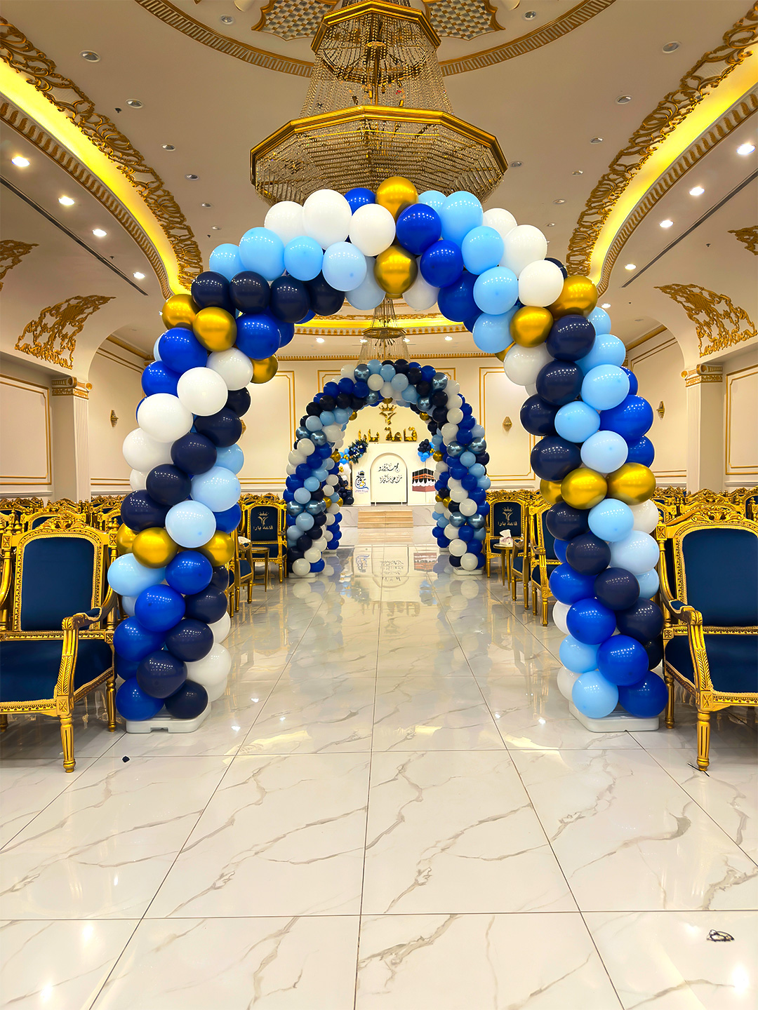 الألوان والديكور: اعتمد التنسيق على لوحة ألوان متناسقة تشمل الأزرق الملكي، الأزرق السماوي، الأبيض، والذهبي، ما يمنح المكان هدوءًا ورصانة تعكس فخامة الحدث. كما تضمنت القاعة أقواس بالونات ضخمة متتابعة، مع تنسيقات زهرية بالأزرق الداكن والأبيض، لتجسيد الطابع الرسمي والراقي للمناسبة.