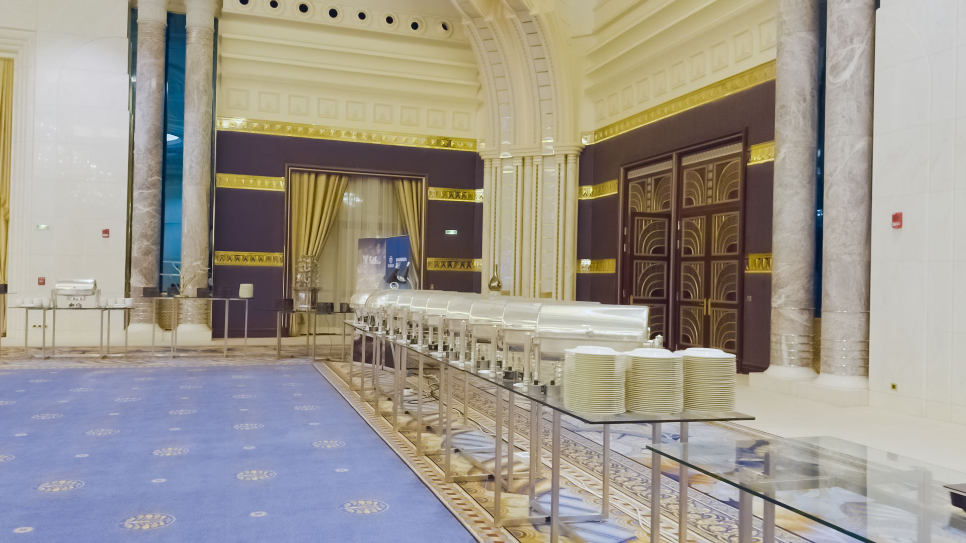 •تغطية أرضية المسرح بموكيت يضفي على المشهد النهائي طابعًا رسميًا ومظهرًا متناسقًا.