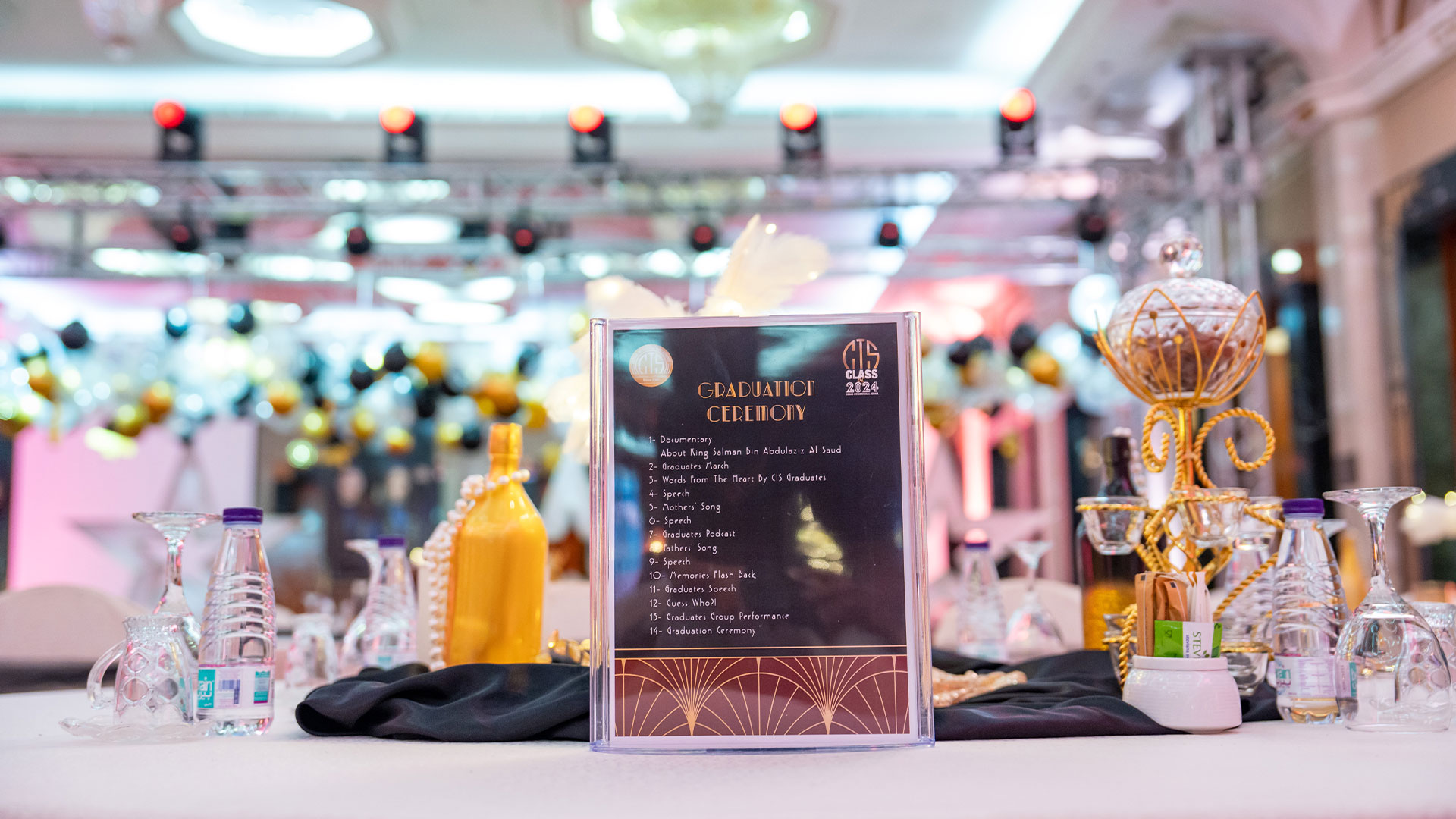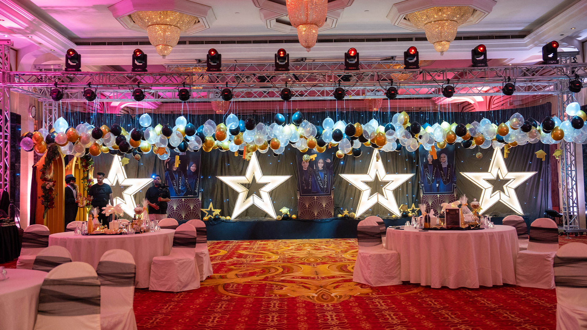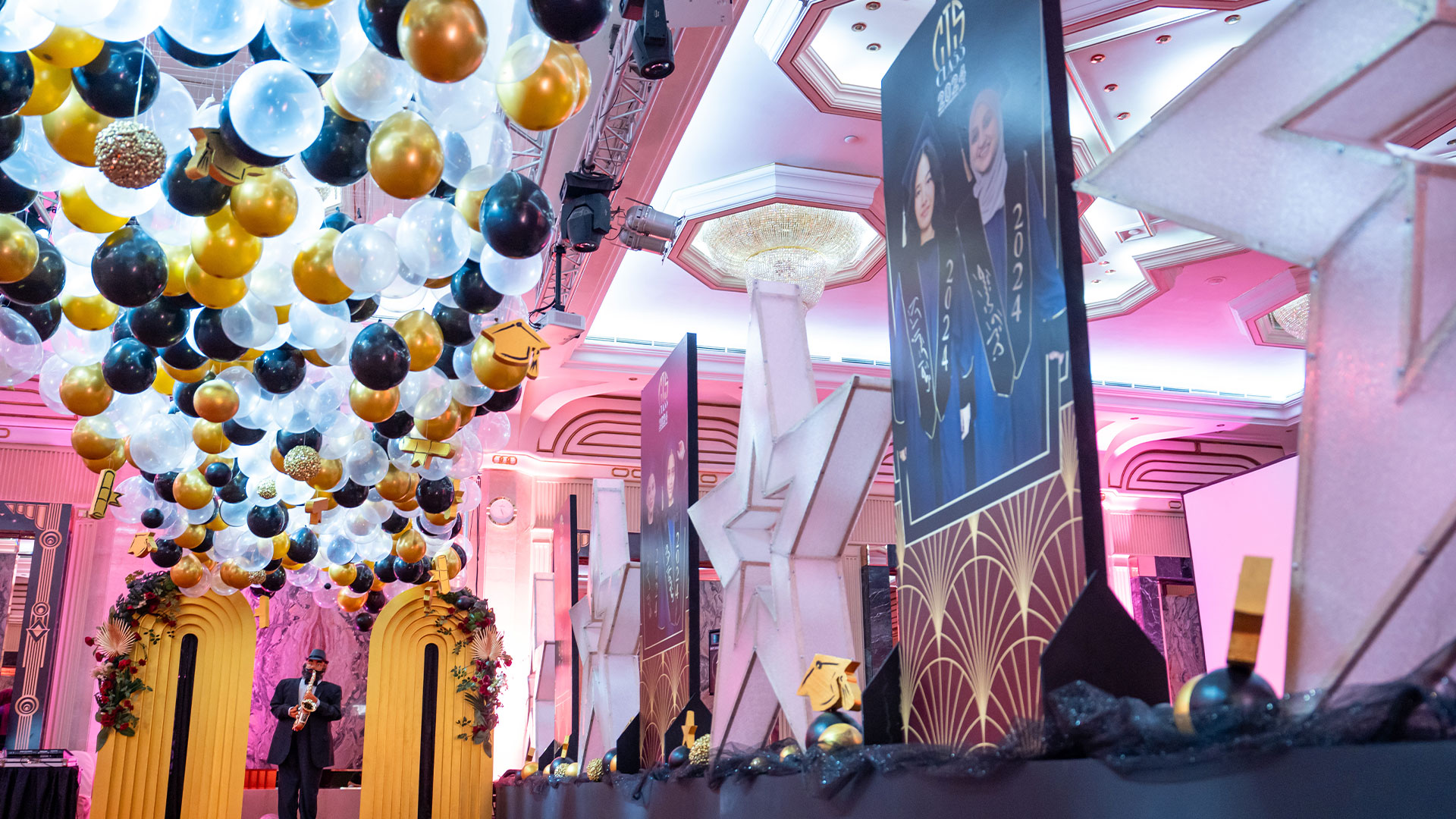 ظهر الحفل بمشهد متكامل يجمع بين الفخامة والاحتفال، مع تناغم واضح بين الإضاءات والمجسمات والخلفيات، مما أسهم في إبراز لحظة التخرج بصورة راقية وتنفيذ احترافي يعكس جاهزية الفريق وقدرته على تقديم جميع خدمات التنظيم تحت مظلة واحدة